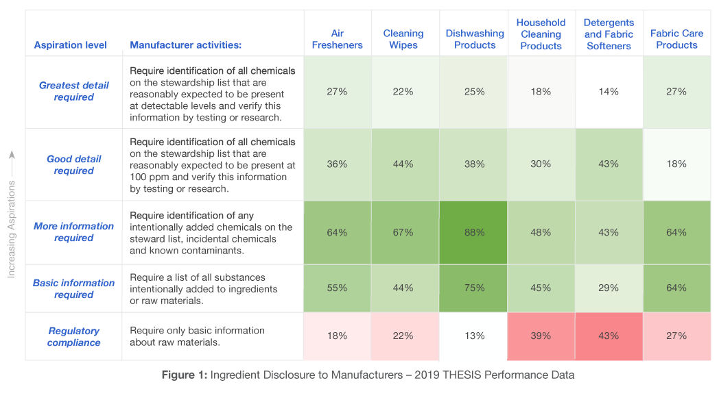 Figure 1 summarizes THESIS 2019 performance on the topic of ingredient information requested from raw material suppliers. Response options are listed in decreasing order of aspiration (i.e., higher rows require more detailed information) and the heat map shows the percentage of suppliers that were able to respond at each level per category. Here darker green is better and darker red is worse. Note that Dishwashing Products outperforms other categories by requiring the basic activity of identification of chemicals on the stewardship list for all raw materials procured, 88% of suppliers used this approach. Broader industry performance reveals that most brands in the other categories struggled to obtain the highest level of ingredient detail from their suppliers. This means that the industry is falling short on requiring detailed information where reasonably expected chemicals may be present (i.e., companies aren’t looking for known contaminants or expected reaction byproducts in procured raw materials).
