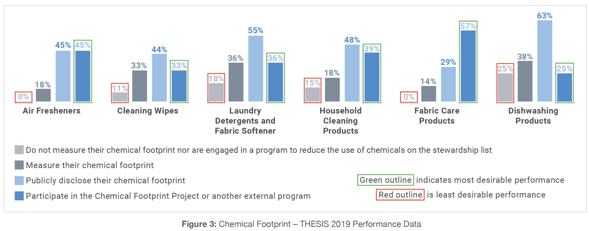 Chemical footprint disclosure means that companies publicly release the total mass of chemicals sold by their company, used in their manufacturing operations and by their suppliers, and contained in packaging that meet certain hazard criteria. Figure 3 summarizes THESIS 2019 performance on the topic of chemical footprints. Like other sustainability performance measurements, companies are achieving basic activities like internally measuring their chemical footprint, but they are not externally collaborating or publicly disclosing their results.
