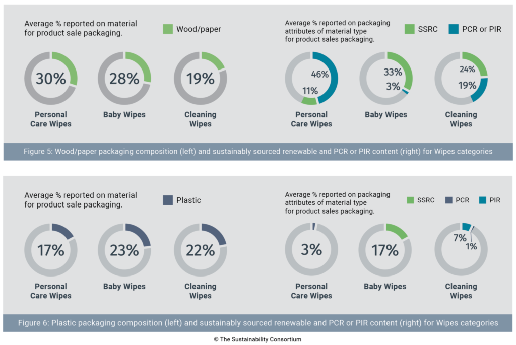 In the unique case of Home and Personal care products, THESIS alignment with the Beauty and Personal Care Product Sustainability Rating System introduces an additional layer of insight into packaging – material type. Personal Care Wipes and Baby Wipes report a similar percent of wood/paper packaging material usage (28%-30%) with notable differences in the percent of sustainably sourced renewable content and PCR or Post Industrial Resin (PIR) content. Sustainably sourced renewable content dominates in Baby Wipes, while PCR or PIR dominate in Personal Care Wipes.
