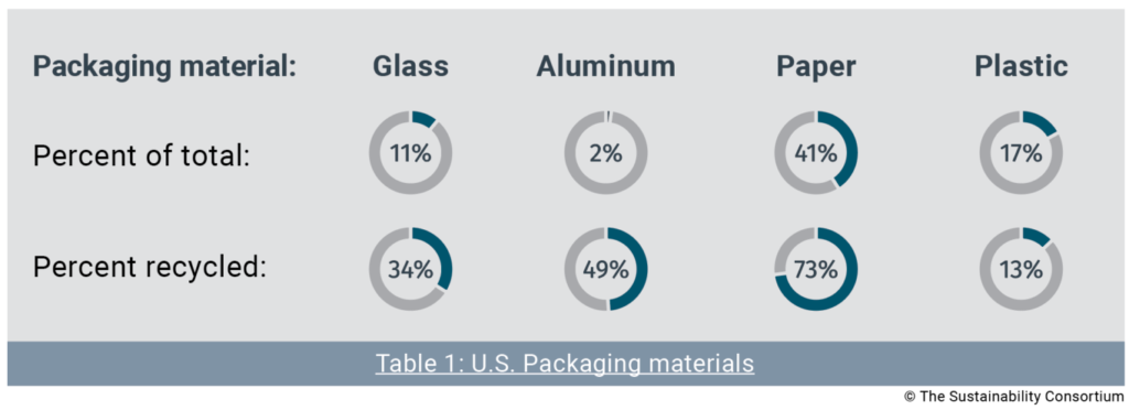 Most consumer packaging consists of just a handful of materials – glass, metal, paper, and plastic. In 2017, packaging made up 29.9 percent of all solid waste in the U.S. table one below shows the percent of packaging waste in U.S. in 2017 by material, and its recycling rate. Materials primarily used for transportation packaging have been excluded.
