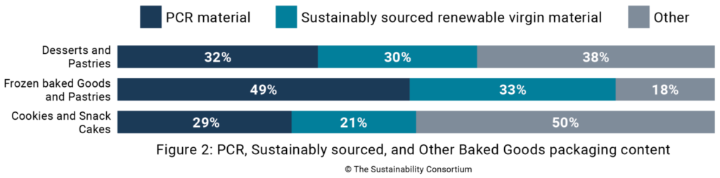Figure 2 shows the packaging raw material sourcing data for three different bakery-related food categories. We note that Frozen Baked Goods and Pastries has the highest amount of PCR content – all three categories use paper and plastic, which can have PCR content, but Frozen Baked Goods and Pastries are more likely to