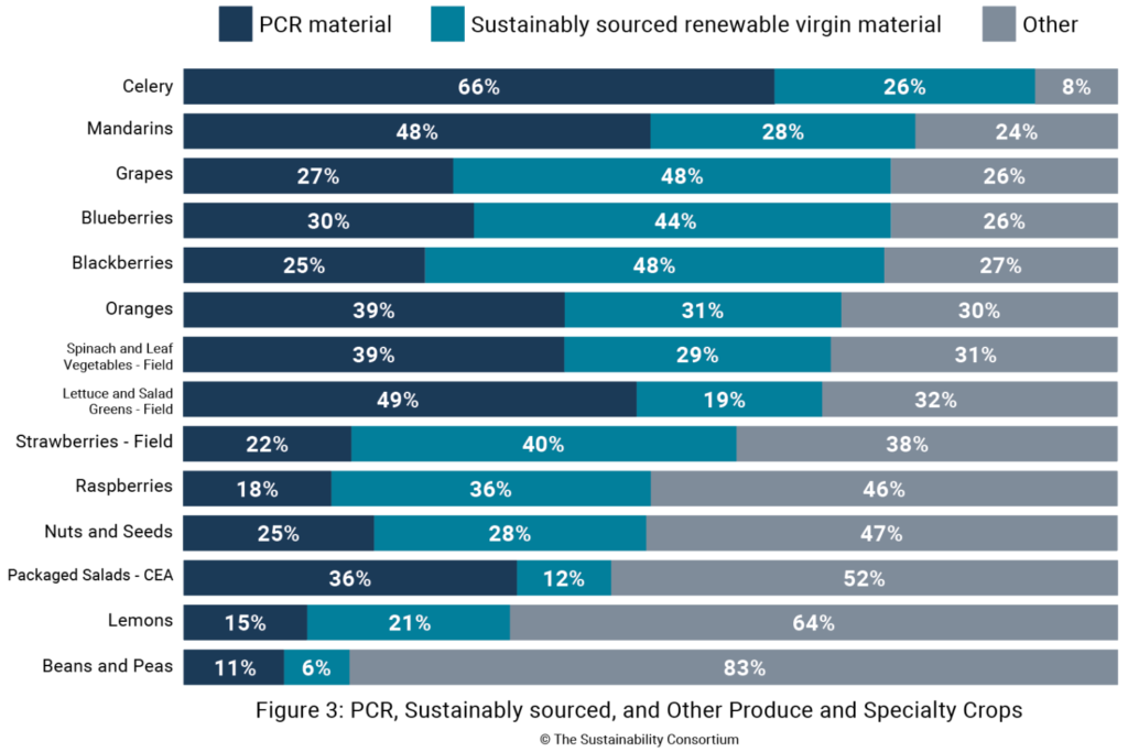 Figure 3 shows the packaging raw material sourcing data for select specialty crop and produce categories. While there is much attention to improving the sustainability of packaging, it is not something that can be done instantly. Once a decision to change packaging design is made, there a new design must be created, suppliers and new tooling must be chosen, and on-package communication must be changed. In most manufacturing systems this may take 2-4 years. Across manufacturers using THESIS, however, we can see improvement trends.
