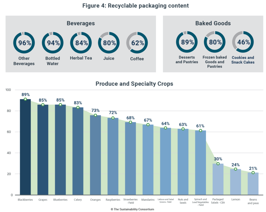 The theory of this KPI is there are design and manufacturing decisions that can make packaging more sustainable, one of which is making the sales packaging recyclable. In nearly half of the analyzed categories of consumer goods, more than 80% of the sales packaging was recyclable. And yet, according to the EPA, only 25% of municipal waste in the United States was recycled in 2017 while 52% went to landfill.