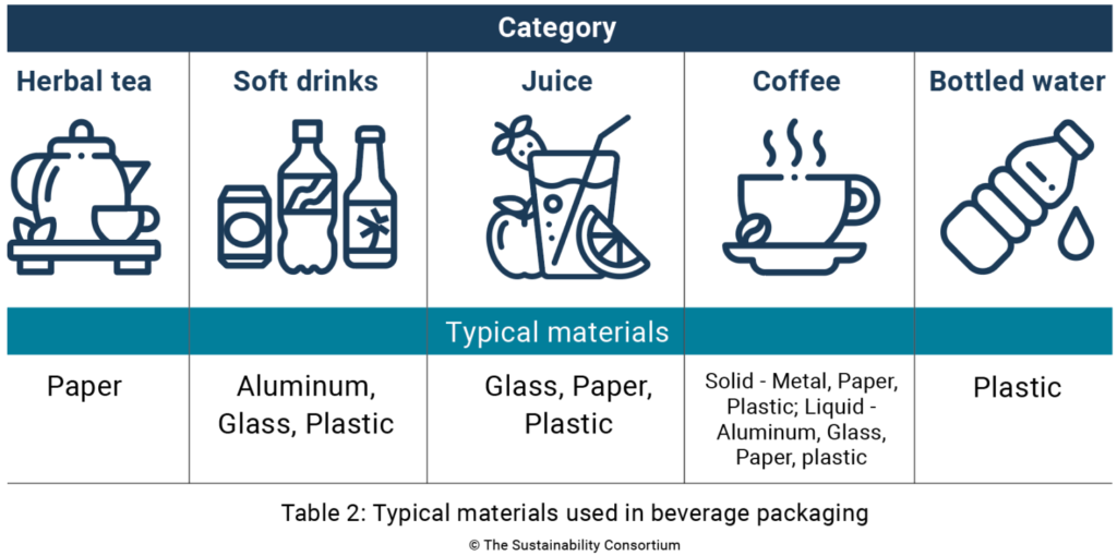 These data represent 36 product manufacturers, each making their own packaging design decisions, so variation in the data is expected. Some of the variance though is due to the different types of materials the categories typically use. Table 2 provides some typical materials used in each in each category. The high amount of sustainably sourced renewable virgin material in Herbal Tea is in part due to the primary material being paper based, which can be explicitly certified as sustainably sourced (via e.g., FSC or SFI certification). Metal, glass, and plastic generally do not have certifications that enable a sustainably sourced claim. All the categories have similar amounts of PCR material, except Bottled Water which is lower. This may be because Bottled Water is typically only packaged with plastic, and metal, paper, and glass generally have more PCR content than plastic today.