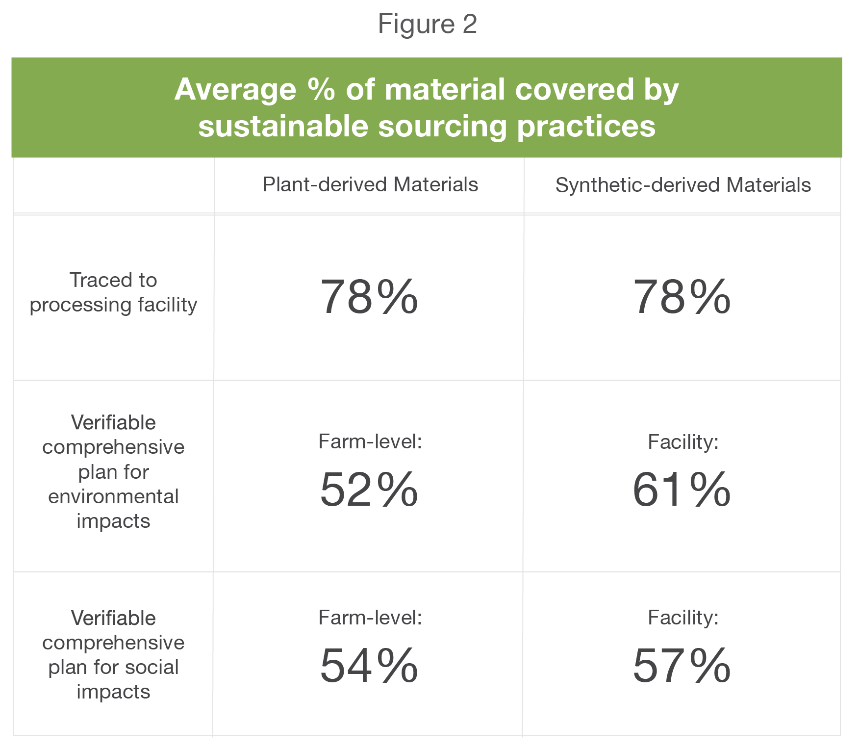 Figure 2 to the right shows the relevant THESIS data from 2020. While some textile categories are seeing significant improvements in sourcing practices (e.g., Bedding’s synthetic material sourcing and Curtains’ plant-based material sourcing), 40% or more of material assessed was not verified to be covered by sustainable sourcing practices. The numbers are similar for both plant and synthetic materials.