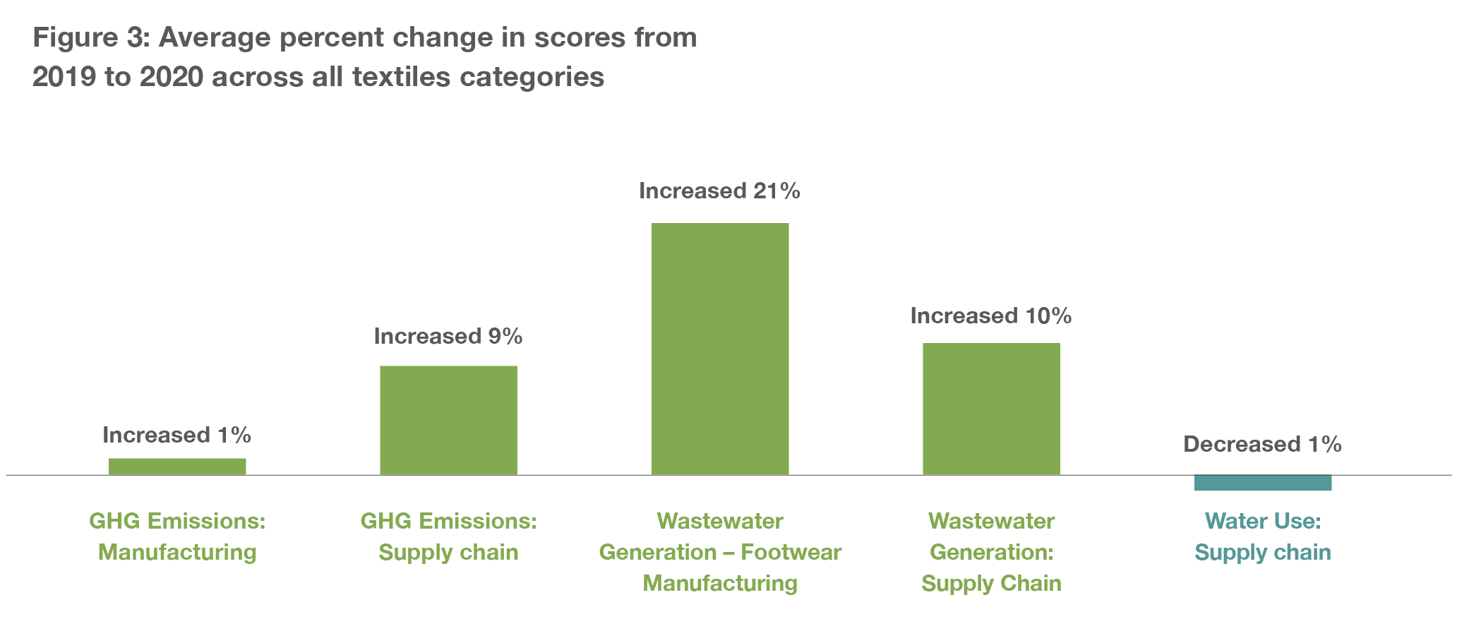 Higher-end clothing brands like Stella McCartney are responding with a recognition and reevaluation of their largest impacts – land use and GHG emissionsx. And, thanks in part to retailers using THESIS and launching programs like Walmart’s Project Gigaton, calls for action are being received by brands that have been focused on hotspots consumers may find easier to understand, like organic cotton and removing dyes and fragrances. Science-based organizations and initiatives like The Sustainability Consortium (TSC), the Sustainable Apparel Coalition, ZDHC, the Science Based Targets initiative (SBTi), and the Ellen MacArthur Foundation are helping these brands shift their focus to bigger impact hotspots like GHG reduction, water use, and wastewater treatment, all of which are imperative for sustainable textiles. Yet progress on most of these issues, particularly GHG emissions at manufacturing and water use in the supply chain has been slow (see Figure 3).